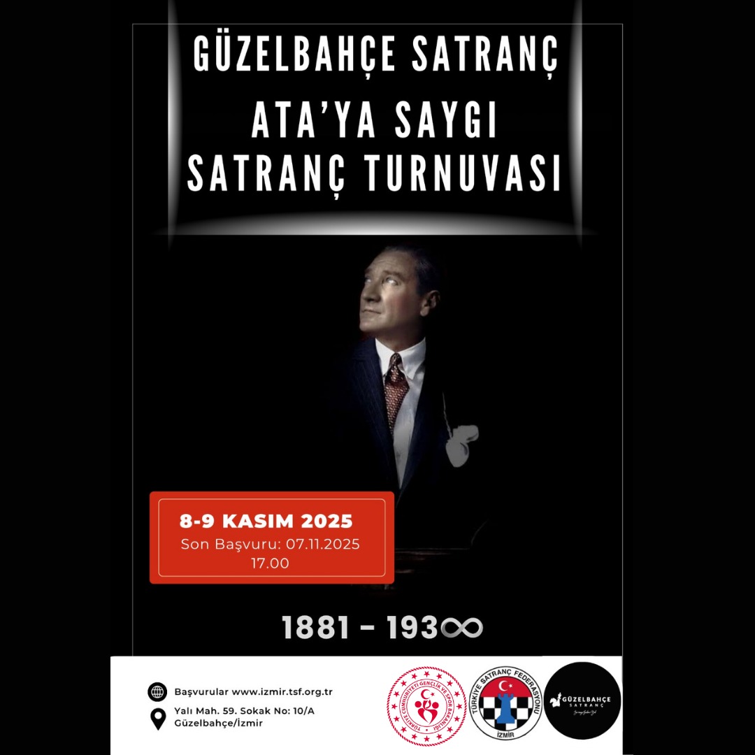 "Güzelbahçe Satranç 10 Kasım Ata'ya Saygı Satranç Turnuvası" 8-9 Kasım 2025 tarihlerinde Yalı Mahallesi 59. Sokak No:10/A Güzelbahçe'de yapılacaktır.