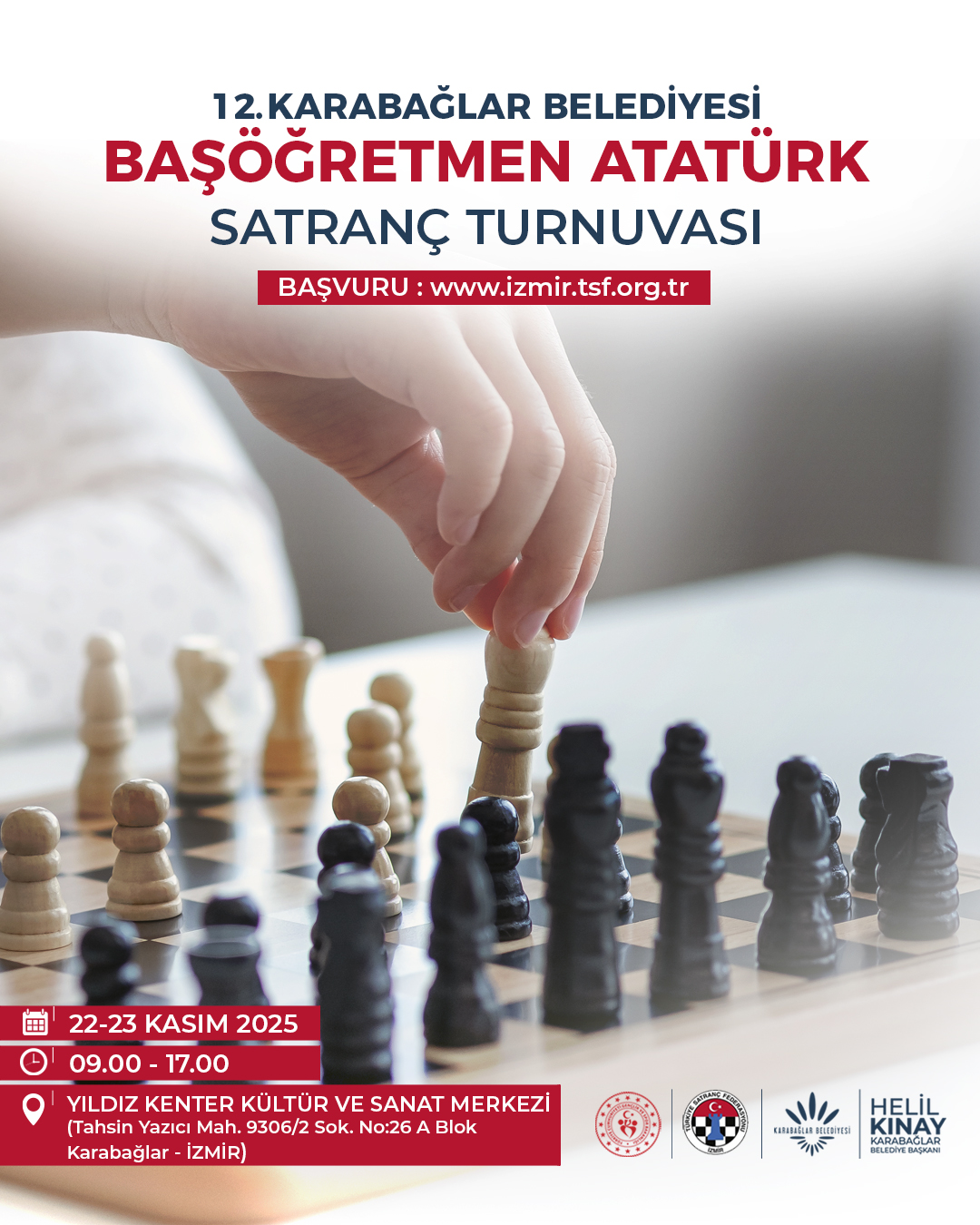 "Karabağlar Belediyesi Başöğretmen Atatürk Satranç Turnuvası" 22-23 Kasım 2025 tarihlerinde Karabağlar Belediyesi Yıldız Kenter Kültür ve Sanat Merkezi' nde yapılacaktır.