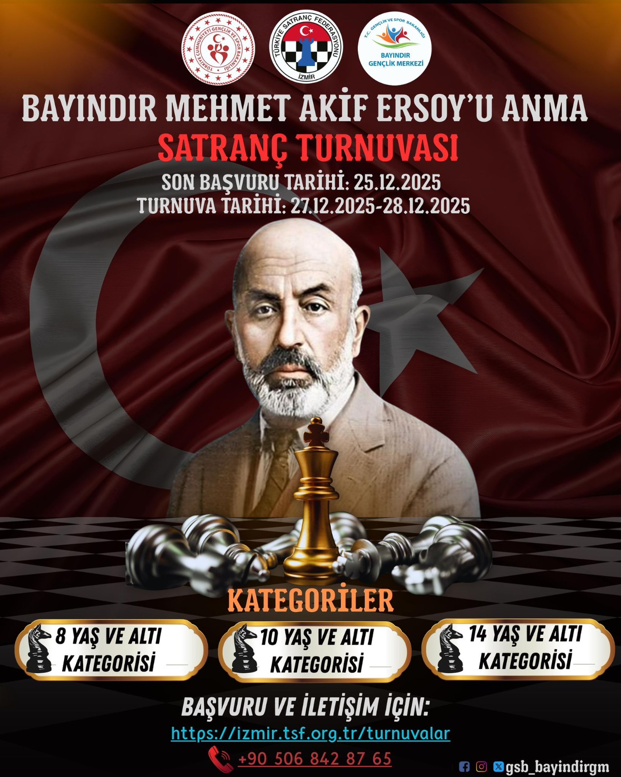 "Mehmet Akif Ersoy'u Anma Satranç Turnuvası" 27-28 Aralık 2025 tarihlerinde Bayındır Kapalı Spor Salonu' nda yapılacaktır.