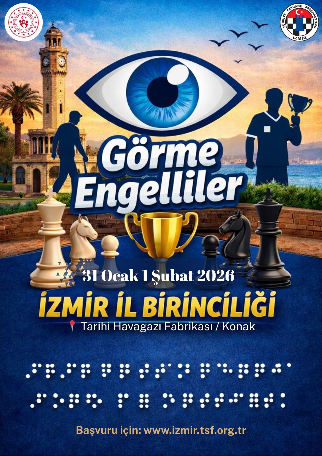 GÖRME ENGELLİLER SATRANÇ İZMİR İL BİRİNCİLİĞİ 31 OCAK- 1 ŞUBAT 2026 TARİHLERİNDE KONAK TARİHİ HAVAGAZI FABRİKASINDA DÜZENLENECEKTİR.