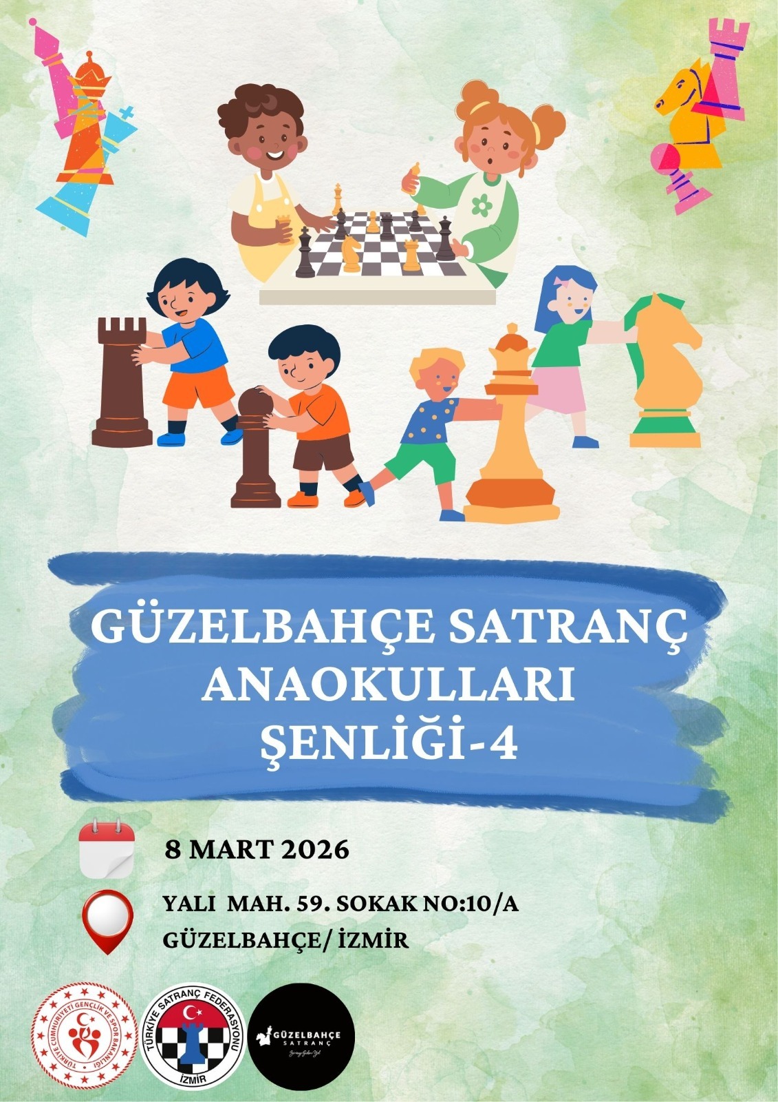 "Güzelbahçe Satranç Anaokulu Satranç Şenliği-4" 8 Mart 2026 tarihinde Yalı Mah. 59. sokak No:10/A Güzelbahçe-İzmir' de yapılacaktır.